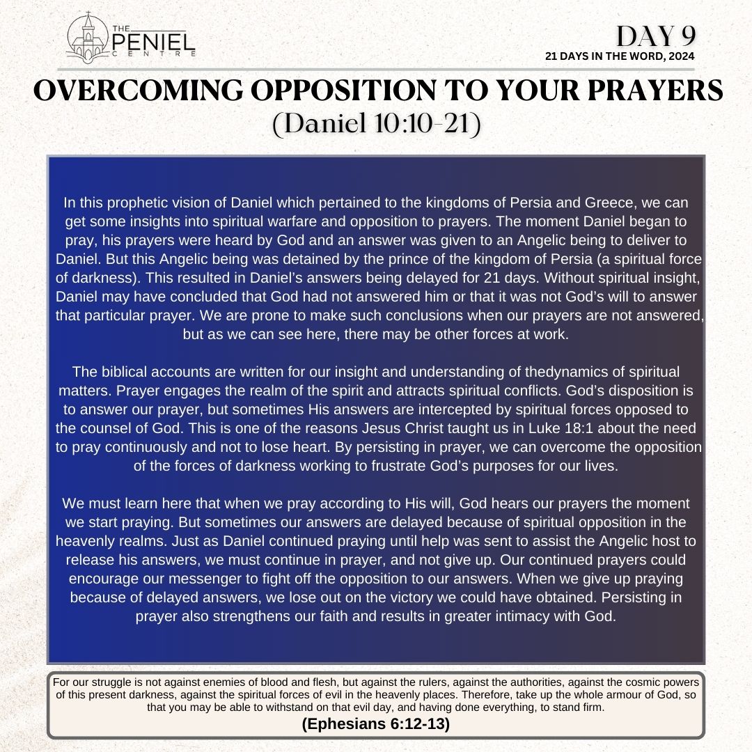 The moment Daniel began to pray, his prayers were heard by God and an answer was given to an Angelic being to deliver to Daniel. But this Angelic being was detained by the prince of the kingdom of Persia (a spiritual force of darkness). This resulted in Daniel’s answers being delayed for 21 days.