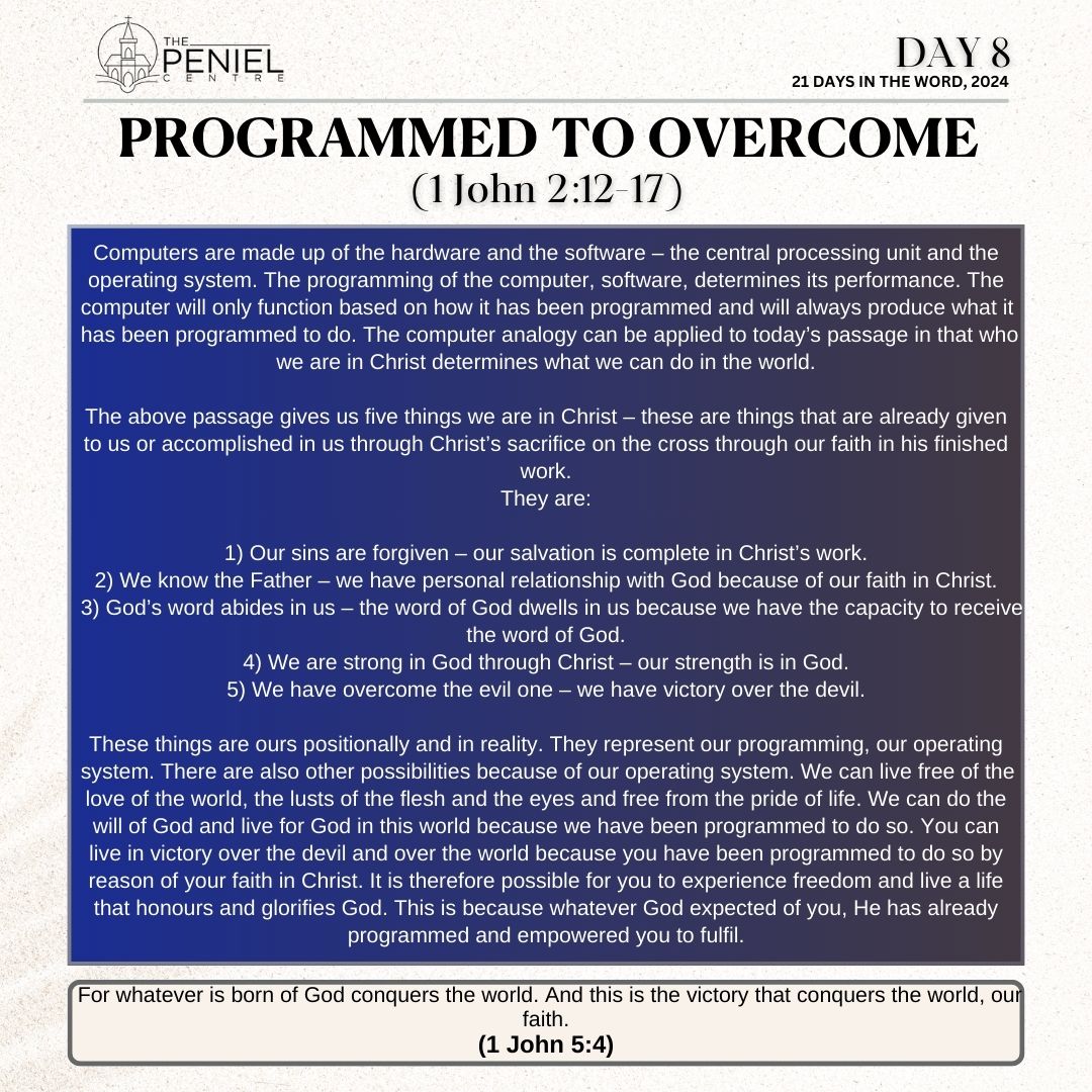 You can live in victory over the devil and over the world because you have been programmed to do so by reason of your faith in Christ. It is therefore possible for you to experience freedom and live a life that honours and glorifies God. This is because whatever God expected of you, He has already programmed and empowered you to fulfil.